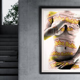 The strong and powerful curves of the female form are flanked by the wrapper of this 80’s icon. A tongue-in-cheek look and stab at a past misogynistic cat-call, turned on it’s head with this playful bubble branding. Hang it individually as a statement piece or with other Art Prints in this series.